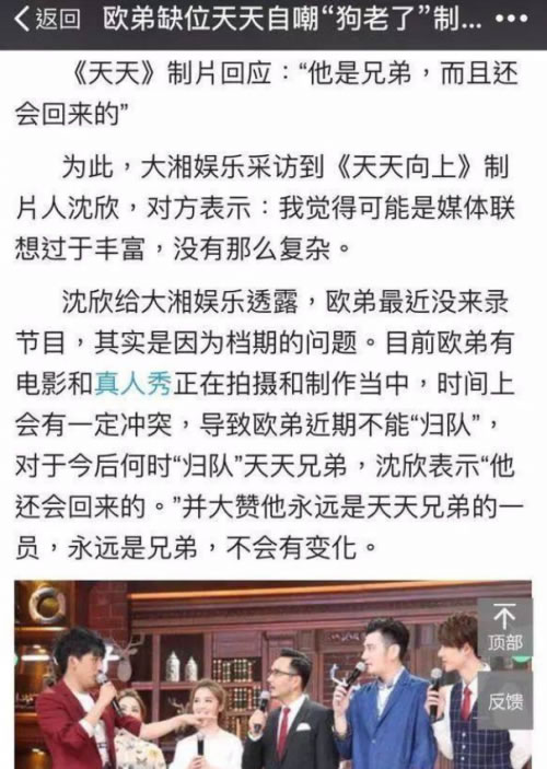 2年前欧弟从《天天》出走,是因为自己爆出被湖南台抛弃,次日又反口说是酒话,当不得真——